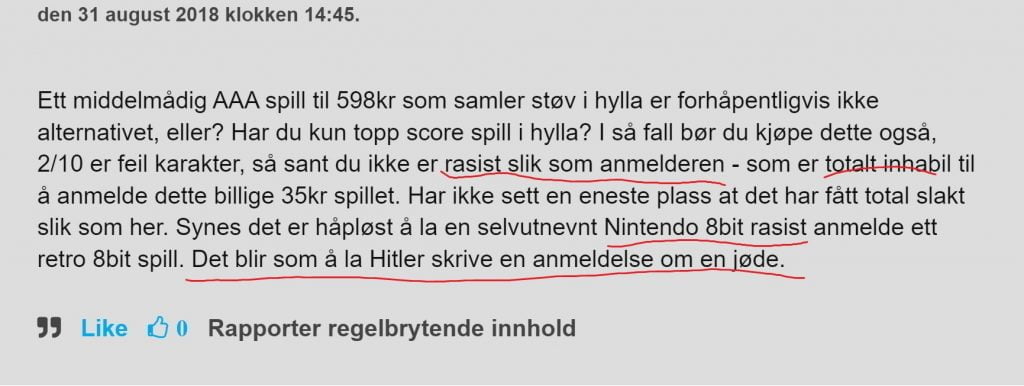 Også ganske selvforklarende… Dette er rimelig mildt. Bare et helt standard «heated gamer moment» med en liten drapstrussel som pynt. NBD sammenlignet med hvor ille det kan bli! Har du fulgt med vet du at det kan bli så jævlig mye verre. Bare se på hva som skjedde med Zoë Quinn, Brianna Wu og Anita Sarkeesian under Gamergate. Eller kvinnelige tegneserieskapere under Comicsgate (Gamergate i ny drakt). Eller hva som skjer NÅ med de kvinnene som har våget å snakket ut om seksuelle overgrep i spillbransjen. Anbefaler alle å lese Crash Override for å få et ordentlig inntrykk av omfanget på trakasseringen kvinner blir utsatt for.