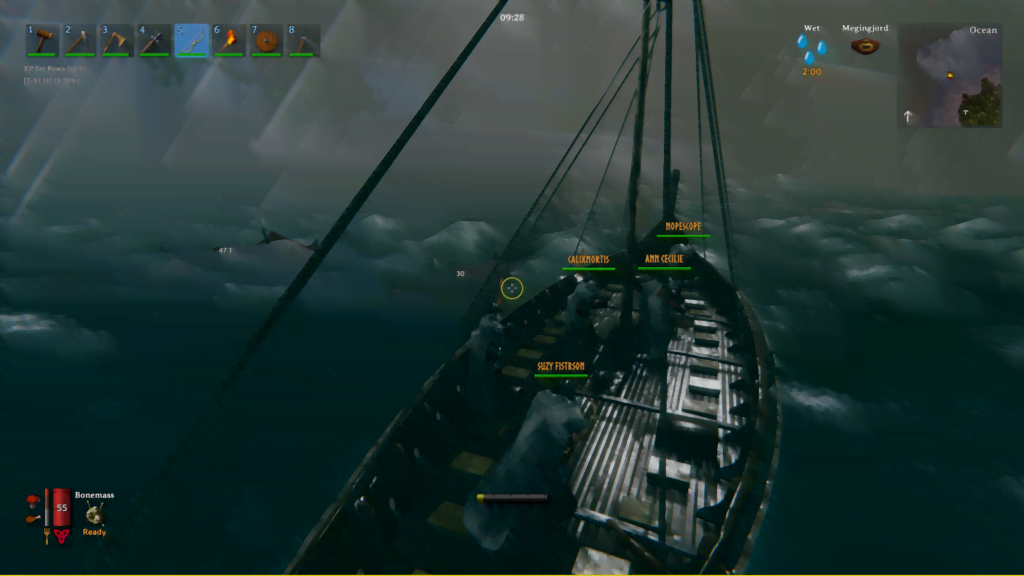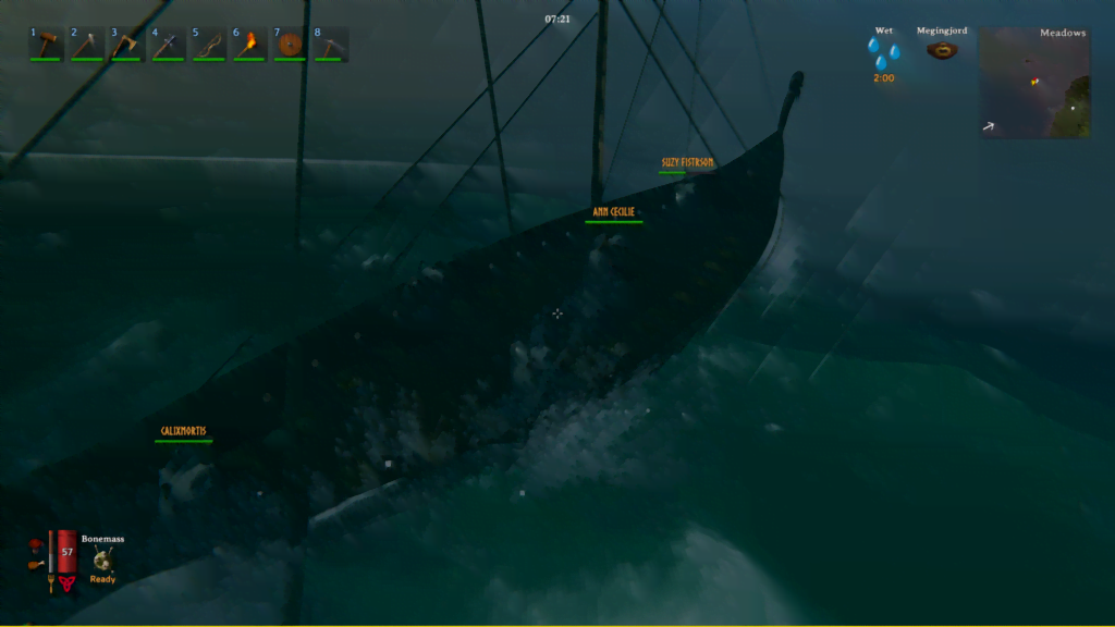 Skammen kastet han på sjøen, og om noen besøker serveren og finner et tjuetalls ødelagte økser og en del hammere så vet dere altså nå hvorfor. Ikke lenge etter fikk vi med bror til Suzanne: Stian. Selv om vi hadde klart oss ganske greit bare vi to, begynte ting for alvor å skyte fart når vi fikk en tredje spiller. Ja, man kan spille Valheim solo, men vær obs på at det kommer til å ta fryktelig lang tid. Med tre spillere fikk vi plutselig til å parallellisere oppgaver og fordele ansvarsområder. Én kunne gå og hogge ned trær mens en annen jaktet på kjøtt og skinn, og den tredje organiserte og bygget basen hjemme.