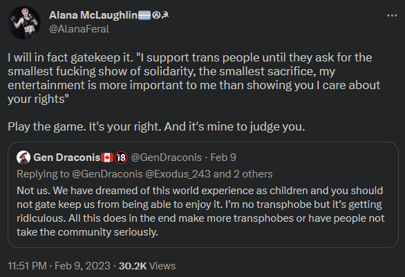 Så når transpersoner forteller oss, nei, de trygler oss, om å ikke støtte transfobene, så er det seriøst den minste sak i verden og lytte til hva de sier, og faktisk ikke støtte de forbanna transfobene. Det krever så lite. Det krever bare at man ikke spiller et spill og gir penger til et innflytelsesrikt menneske med millioner av følgere som ønsker at de ikke lenger skal eksistere. Hvis vi ikke engang kan få til det, hva kan de forvente av oss når det virkelig røyner på? Er et stykke underholdning viktigere enn folks liv, rettigheter og verdighet?