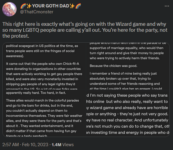Vi har hatt måneder på måneder med diskurs om hvorvidt det er ok å spille og/eller anmelde Hogwarts Legacy. Svaret har alltid vært at det er helt greit. Ingen prøver å nekte noen å spille dette spillet. Ingen ønsker å stoppe folk som ønsker å anmelde spillet fra å gjøre det. Det man derimot har bedt om er at man har forståelse for at man ikke kan kalle seg selv en alliert. I hvert fall ikke når man i samme slengen kaster rundt seg med prinsipper som “death of the author” og “man må kunne skille kunsten fra kunstneren,” som et slags labert forsøk på å rettferdiggjøre at man syns Harry Potter er kult, og at det ikke betyr at man støtter J.K. Rowling. For Rowling har jo ikke tatt del i utviklingen av spillet, og utviklerne har gjort mye for å ta avstand fra hennes skadelige og transfobiske holdninger, ikke sant?